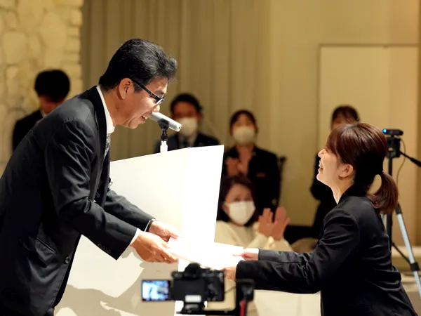 - 毎年1月の全国総会にて、個人に対し「感謝状」「優秀社員賞」を、部門または店舗に対し「感謝状」「優秀部門賞」の表彰を行っています。また、「極める賞」と称して事業部別に販売力を伸ばした社員を表彰。このように様々な表彰制度を設け、社員の功績や業務への取り組みを評価し、一人ひとりのモチベーションの向上に努めています。