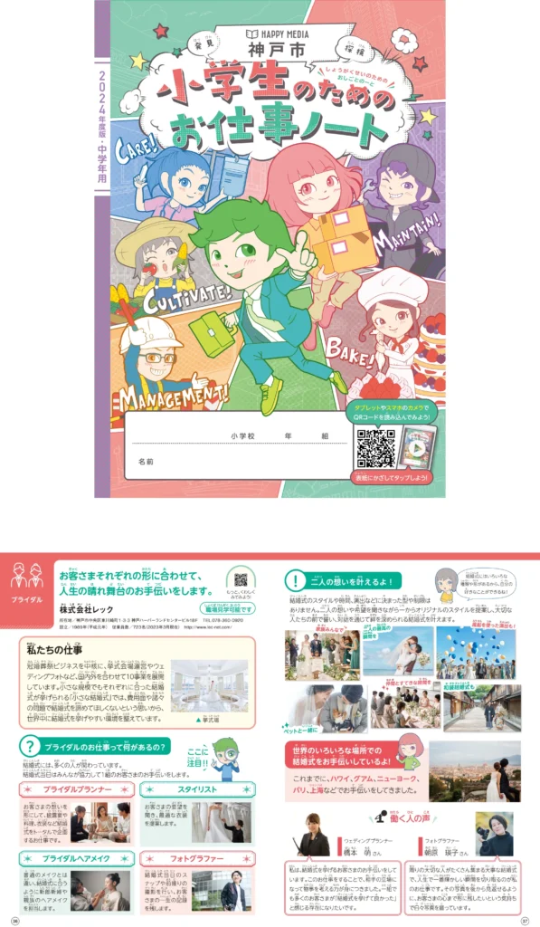神戸市内の小学校の3・4生、約25,000人に配布される「小学生のためのお仕事ノート」(神戸市 2024年度版)にレックのブライダル事業が掲載されました。